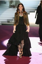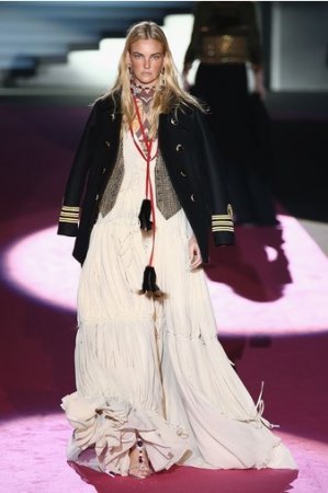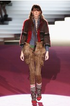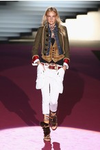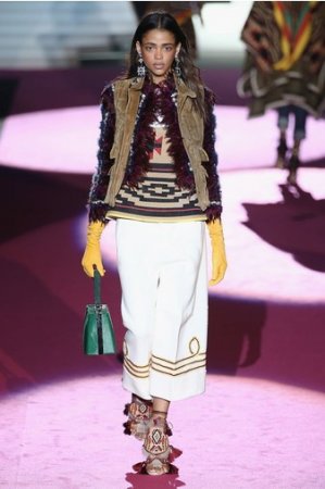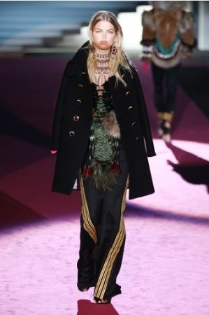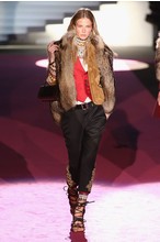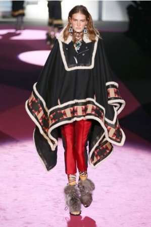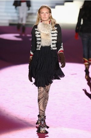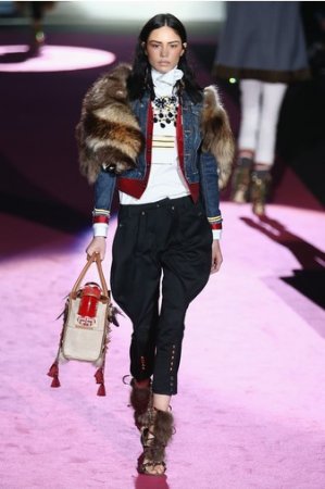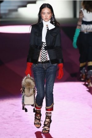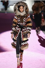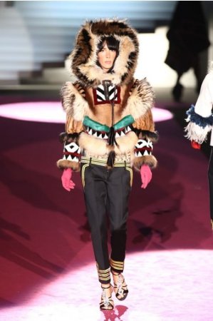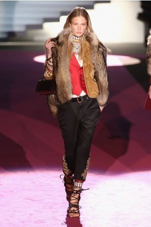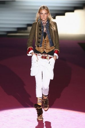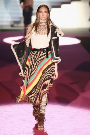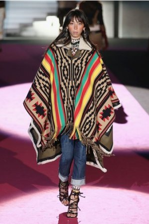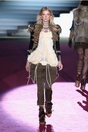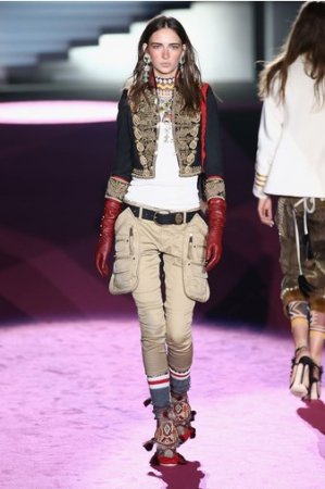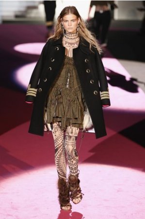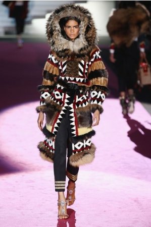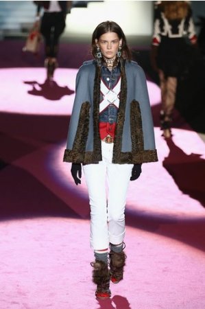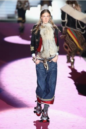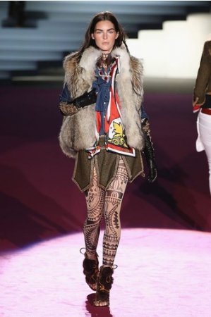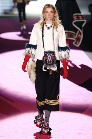 Что дотрагивается самой коллекции, то DSquared2 сходу верно заявили основную тему – этнические мотивы. При этом явно, что дизайнеры вдохновлялись культурой не 1-го народа, а различных – тут выслеживаются и индейские мотивы, и южно-американские, и африканские. Здесь же можнож было узреть отсылки к стилю обитателей Аляски. В итоге на подие был представлен пестрый эклектичный микс – принтов, силуэтов, расцветок и материалов.