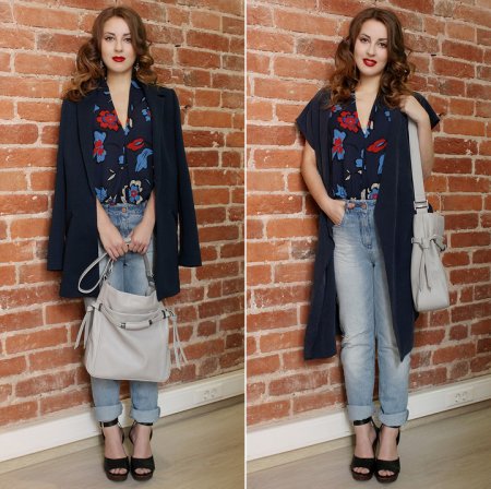 джинсы с высокой талией, легкую блузку с алыми цветами, длинный темно-синий жилет из плащевой ткани, вместительную сумку актуального нежно-голубого оттенка и босоножки на массивном каблуке. Равноценной альтернативой жилетке станет легкое темно-синее пальто-пиджак.