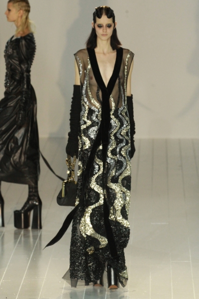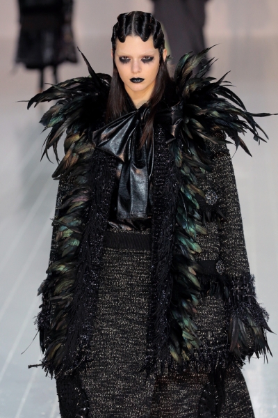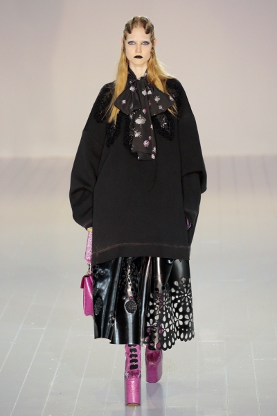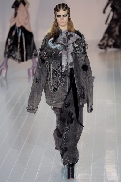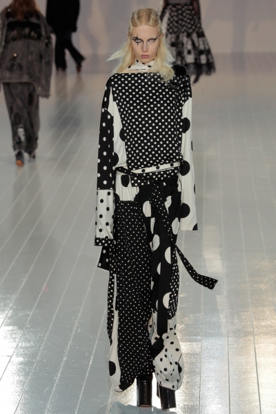 Марк Джейкобс не устает цитировать самого себя: в коллекции можно было найти много реминисценций и на прошлую коллекцию, и на показы десятилетней давности, но делает это настолько тонко, что о повторах не может быть и речи. Темная, готическая цветовая гамма показа вместе с гротескно преувеличенными пропорциями напоминала не то монструозные образы Леди Гаги (певица, кстати, приняла участие в показе в качестве модели), не то костюмы из «Битлджуса», не то кутюрные мечты героев «Семейки Адамс». Как только общее потрясение от стилистики шоу улеглось, гости начали обращать внимание на детали и отделку нарядов, которые были, как всегда у Marc Jacobs, на высоте.
