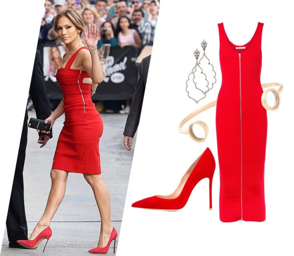 На фото: Дженнифер Лопес. Платье, T By Alexander Wang; замшевые туфли Gianvito, Gianvito Rossi; серьги-подвески из белого золота 18К с покрытием из родия и бриллиантами, Loree Rodkin; позолоченный браслет Invisible Cities, Bjorg