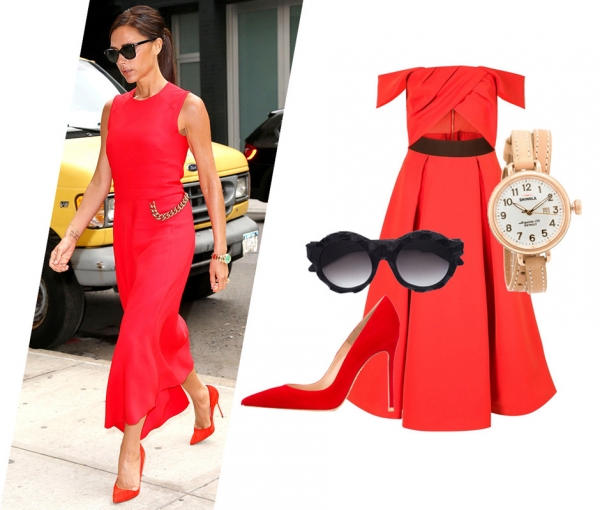 На фото: Виктория Бекхэм. Платье, Self-Portrait; замшевые туфли Gianvito, Gianvito Rossi; часы The Birdy с кожаным ремешком и золотистым корпусом, Shinola; солнцезащитные очки Mask K10, Kuboraum.