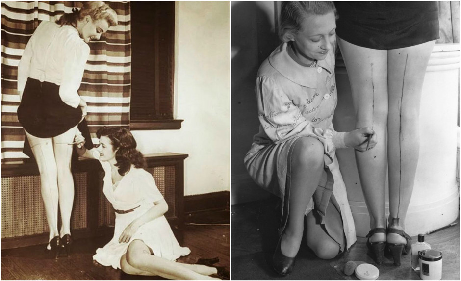В 40-е годы в США появляется такое явление, как «макияж ног». Нейлон был невероятно дефицитным продуктом, потому что его использовали для изготовления парашютов. Американки начали рисовать тонкую линию на ноге, имитируя эффект заднего шва чулок, некоторые даже прорисовывали «пятку». Отсутствие колготок и чулок стало причиной популяризации брюк, которые консервативные американки не очень-то жаловали ранее.
