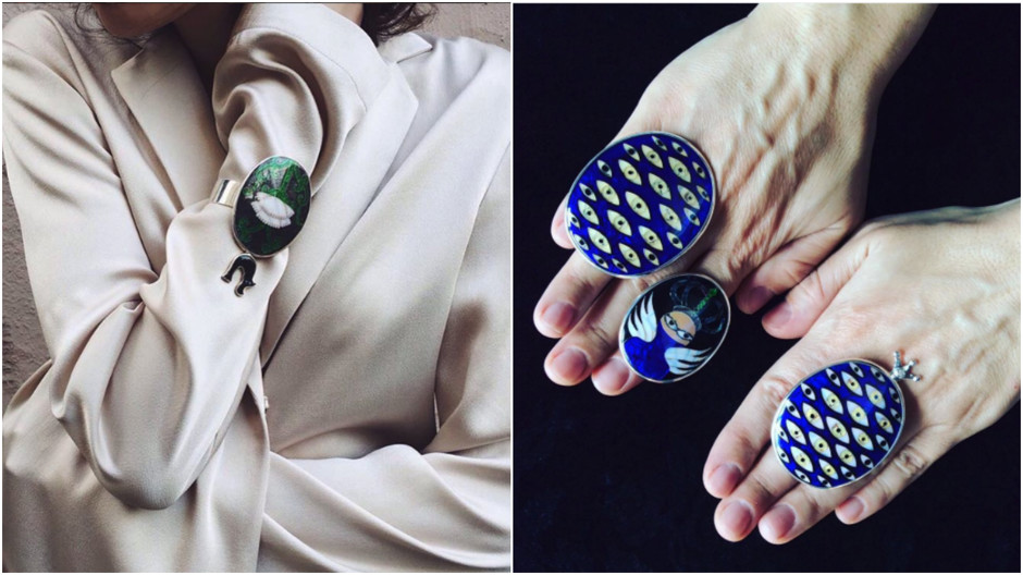 Софо Гонглиашвили представляет и красивые свитеры с вывязанными цветами, и платья с причудливыми птичками, но ее абсолютным шедевром можно считать крупные украшения из керамики. Дивные кольца с изображениями чертополоха, барсов и деревьев, массивные серьги и браслеты притягивают взгляды и отвлекают от любого, даже самого нарядного платья. В этих потрясающих украшениях прослеживаются и этнические мотивы, и безусловный стиль, но самое главное — сама Грузия. Особенно интересно смотрятся два-три кольца разной формы и цвета, собственно, так дизайнер и предлагает сочетать свои украшения.