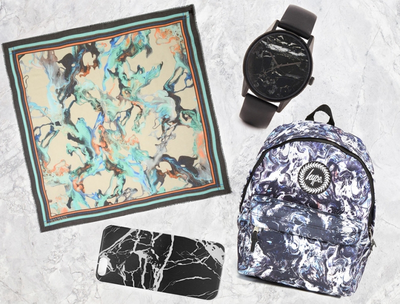 Красивый, природный рисунок мрамора — бесконечное поле для экспериментов. Издалека он может напоминать и змеиную чешую, и экспрессивно разбрызганную краску, и даже мелкие цветы. Совсем как в детском развлечении, когда надо было смотреть на причудливые иллюстрации в книге и находить спрятанные объекты. Мраморные узоры невероятно выигрышно ложатся на циферблаты часов, рюкзаки и особенно на шелковые платки.