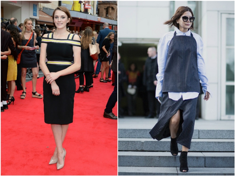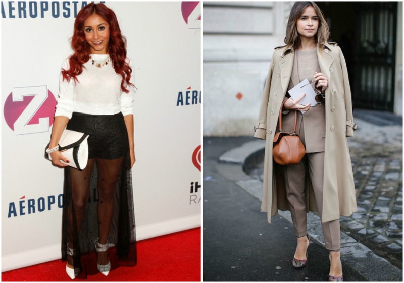 Нет: белый топ, полупрозрачная черная юбка, неуместные аксессуары окончательно уничтожили фигуру. Да: Мирослава Дума блестяще играет с оттенками и фактурами. Благородные цвета и аккуратные аксессуары вытягивают силуэт.