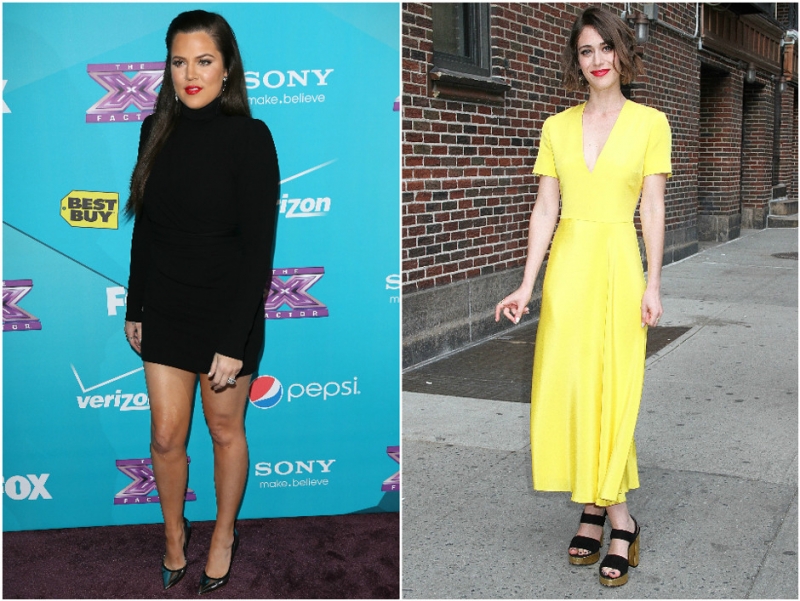 Нет: Ким Кардашьян выбирает обтягивающее, полупрозрачное платье красного цвета и выглядит очень крупно. Да: темные цвета, свободная куртка белого цвета и красивая линия декольте очень идут девушке.