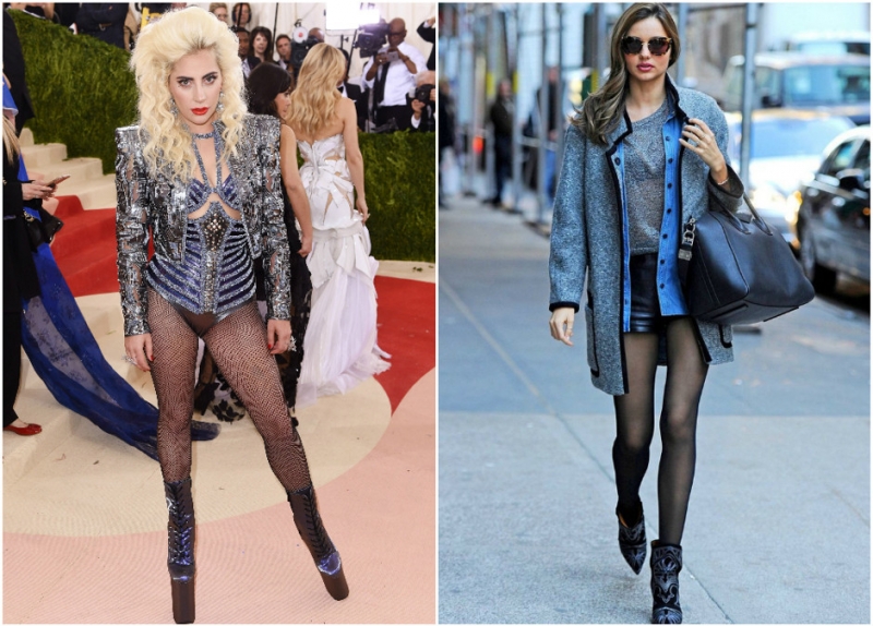 Нет: Леди Гага решила вспомнить прошлое и пришла на торжественное мероприятие в этом экстравагантном образе. Мы не знаем, что нас больше смущает - обувь певицы или колготки в сетку, уничтожившие ее ноги окончательно. Да: казалось бы ноги Миранды Керр - предел совершенства, но в темных матовых колготках они кажутся еще лучше.
