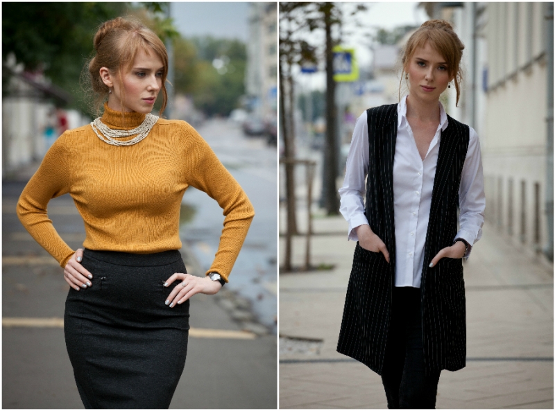 Зато самый простой способ визуально удлинить шею — надеть вещи с V-образным вырезом. Мы выбрали классическую белую сорочку и «закрепили» результат с помощью удлиненного жилета темного цвета в тонкую вертикальную полоску.