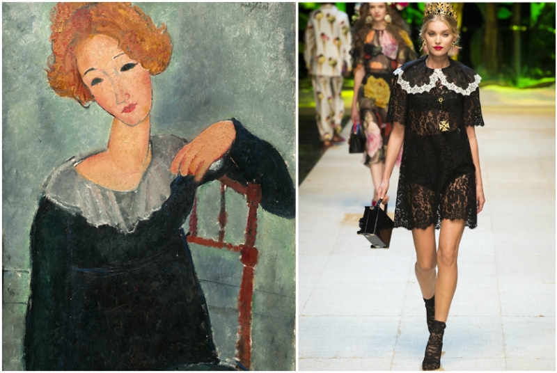 «В кафе». 1949. Леонар Фужита/ Показ Alberta Ferretti.«Женщина с рыжими волосами». 1917. Амедео Модильяни/ Показ Dolce and Gabbana. «Дама с ниткой жемчуга». Микао Кино/ Показ Moschino.