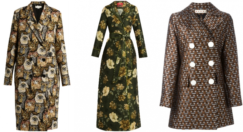 В «богатых» пальто и пиджаках с набивными цветами, зверями и сложными узорами можно представить какого-нибудь помещика из гоголевских «Мертвых душ». Прямо не верхняя одежда, а какой-то барин-стайл, новый малиновый пиджак, на котором распустились бутоны и который не стыдно надеть в приличное общество. Носить пальто из жаккарда можно с объемной водолазкой спокойного цвета, с джинсами или брюками.