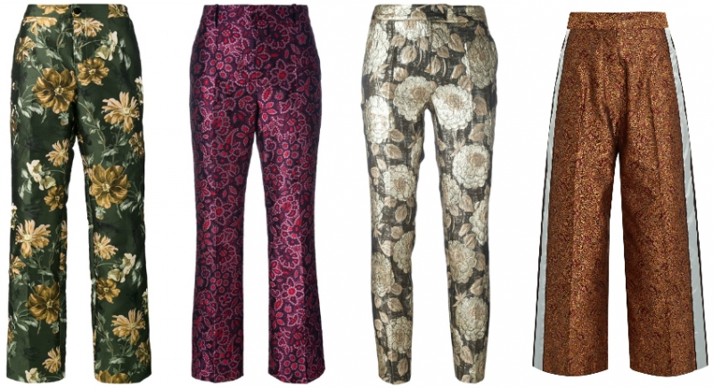 Жаккардовые брюки — праздник, который всегда с тобой. Носить стоит с каблуками, только не со шпильками, а с широкими, прямоугольными, устойчивыми. В повседневной жизни к таким брюкам лучше подбирать спокойные вещи вроде джемперов необычных оттенков. Нейтральные цвета образ не испортят, но сделают его скучным, и сам собой будет возникать вопрос: «А при чем тут, собственно, брюки?» Мы советуем не бояться экспериментов и носить простые по силуэту, но сложные по фактуре и цвету вещи. Это может быть свитер с эффектом градиента, шифоновая блуза нежного цвета с красивым, ненавязчивым принтом. Для жаккардовых брюк с металлизированной нитью прекрасно подойдет рубашка с бантом.