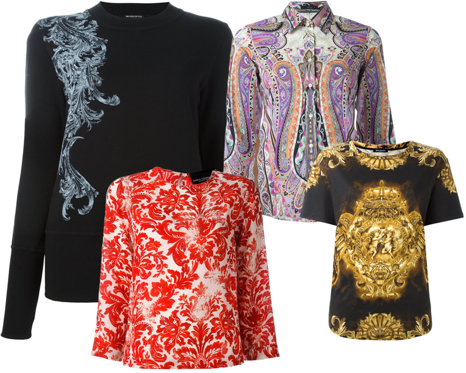 Три главных любителя барокко на сегодняшний день — бренды Balmain, Dolce and Gabbana, а также Versace. Они активно украшают богатыми принтами вещи из своих коллекций, не боятся ярких красок и обилия золота. Впрочем, при желании можно найти и вполне спокойные свитеры с элементами барочной живописи.