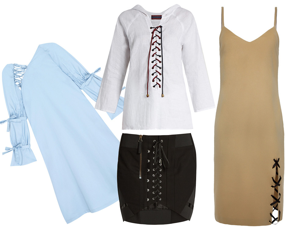 Тенденция, обязанная своим существованием все тем же корсетам и сложным платьям, на шнуровку которых требовалась пара часов свободного времени и пара-тройка помощников. В наши дни ситуация намного оптимистичнее. Шнуровка служит исключительно украшением и, стоит сказать, очень эффектным. Короткие юбки из замши или матовой кожи, рубашки из жесткого, фактурного хлопка или льна, а также кашемировые платья-комбинации — вершина айсберга.