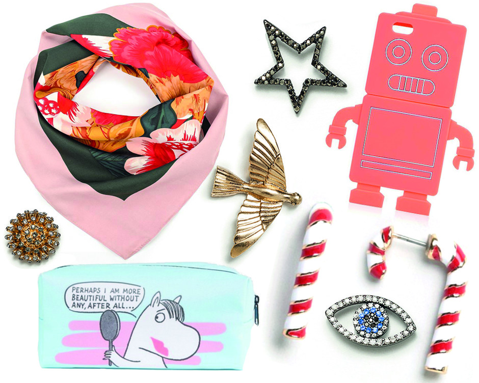 Платок Mango 899 руб.Набор из четырех брошей Zara999 руб.Чехол на телефон Topshop (Lamoda) 970 руб.Серьги Asos461 руб. Косметичка Moomins768 руб.