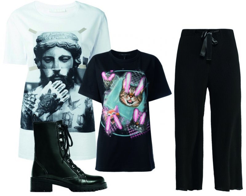 Самый очевидный вариант для любителей основательно подкрепиться — треники и юбки на резинке. Тут можно хоть целого гуся проглотить, никто не заметит. При желании нетрудно даже придумать вполне себе выходной, но вместе с тем комфортный образ с такими штанами. Вам понадобится футболка с красивым принтом, модные высокие ботинки на шнуровке, ну и их величество — треники на резинке.