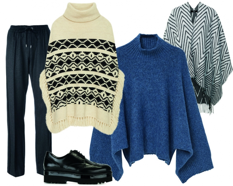 Пончо в сочетании с брюками или юбкой из стрейчевой ткани — отличный вариант для непродолжительной прогулки. Ни одна живая душа не узнает, сколько бутербродов вы разогрели прошедшей ночью.