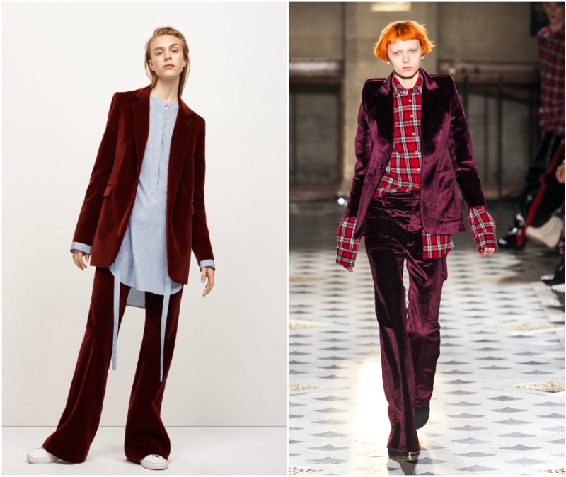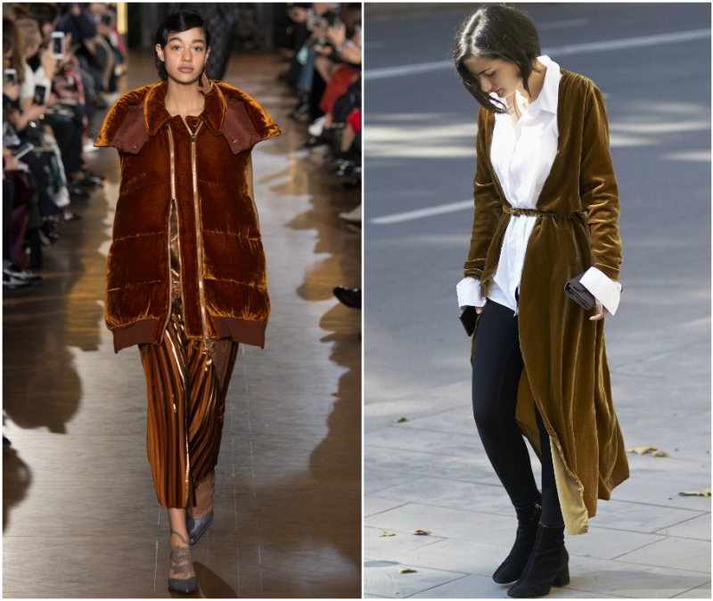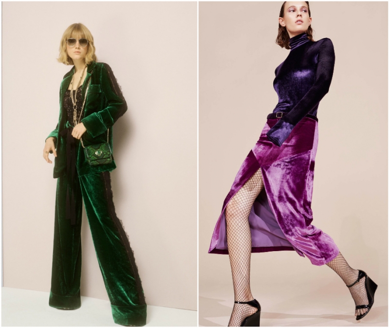 Представляя бархат или вельвет, мы часто держим в голове темные цвета и мрачные оттенки, хотя эти материалы смотрятся очень классно и необычно в ярком исполнении. Зеленый, лиловый, оранжевый, фиолетовый бархат и вельвет присутствовали во многих зимних коллекциях, сохранили свои позиции в весеннем сезоне и уже «засветились» в коллекциях pre-fall. Особенно выигрышно смотрятся два предмета из бархата, схожих по оттенку.