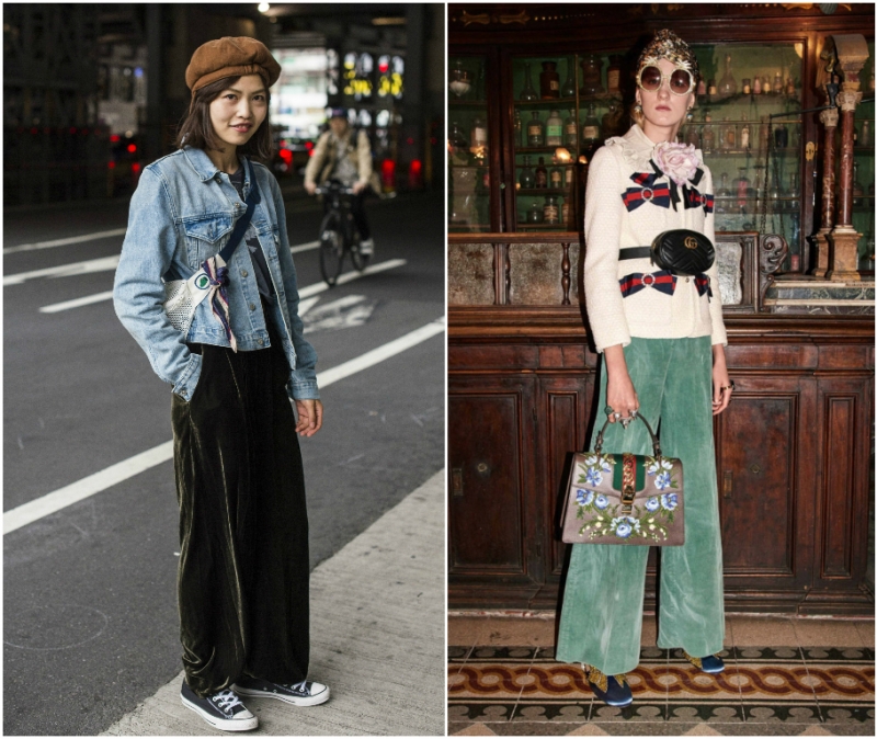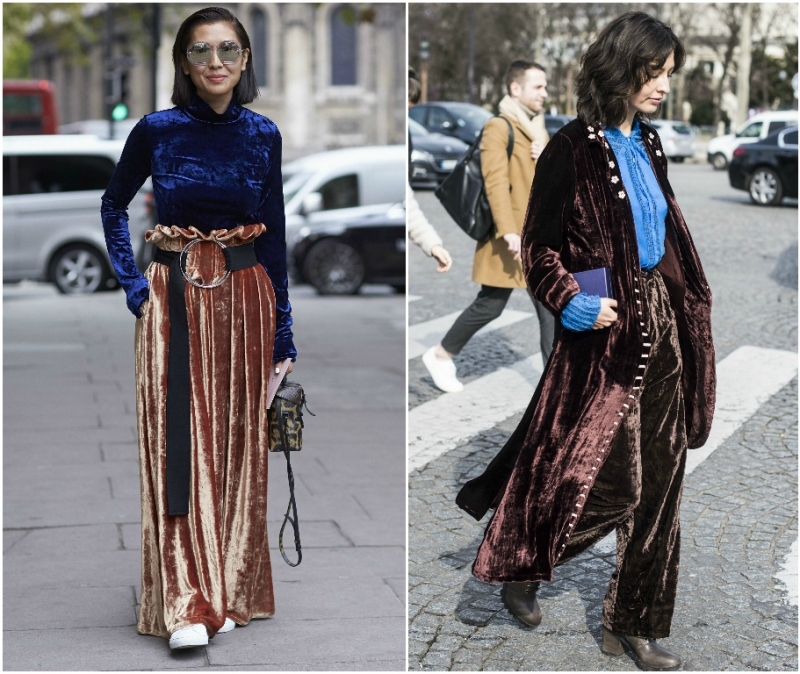 Широкие брюки из бархата или вельвета — необычная замена джинсам, кюлотам и вообще чему угодно. Несмотря на то что бархат воспринимается как достаточно нарядный, если не сказать торжественный материал, на деле он прекрасно совмещается с кедами, денимом и футболками.