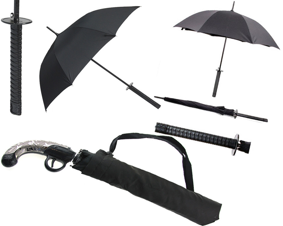 Рано или поздно, но весна наступит, а вместе с ней придут дожди. В такую погоду очень пригодится хороший зонтик. Миниатюрные складные модели, умещающиеся в женскую сумку, настоящему мужчине не подойдут. Чопорные трости не всегда вписываются в городской стиль одежды. К счастью, есть интересные мужские зонты, которые сочетаются с любыми вещами. Мужчины часто хотят казаться более суровыми и серьезными, чем на самом деле. А что может быть суровее рукояти меча за спиной или «пистолета», выглядывающего из кармана?