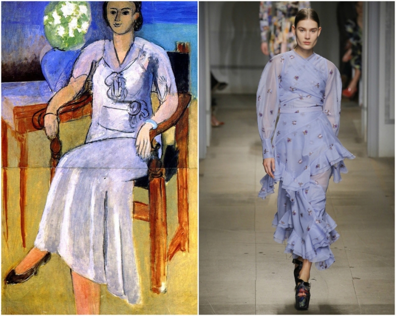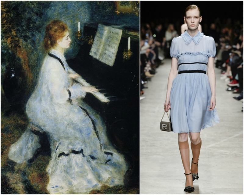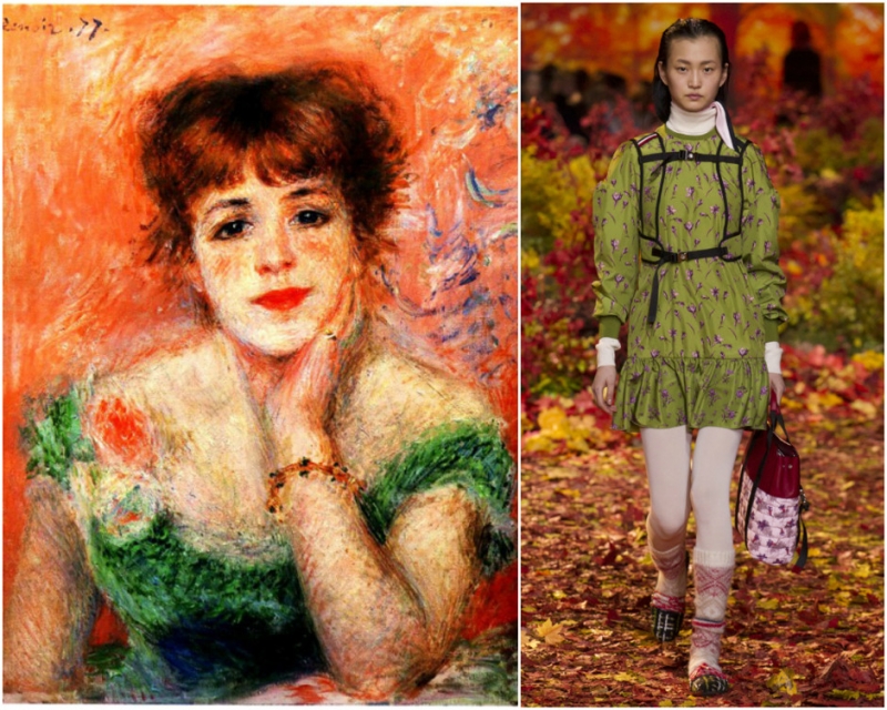«Женщина в белом платье». Анри Матисс. Образ из коллекции Erdem. Образ из коллекции Gucci. «Ветреницы». Джон Уильям Уотерхаус. Образ из коллекции Chloe. «Девушка за пианино». Пьер Огюст Ренуар. Образ из коллекции Rochas.