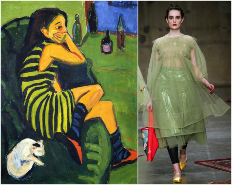 «Девушка с перчатками». Тамара де Лемпицка. Образ из коллекции Marchesa. «Портрет актрисы Жанны Самари». Пьер Огюст Ренуар. Образ из коллекции Moncler Gamme Rouge. «Марселла». Эрнст Людвиг Кирхнер. Образ из коллекции Molly Goddard.