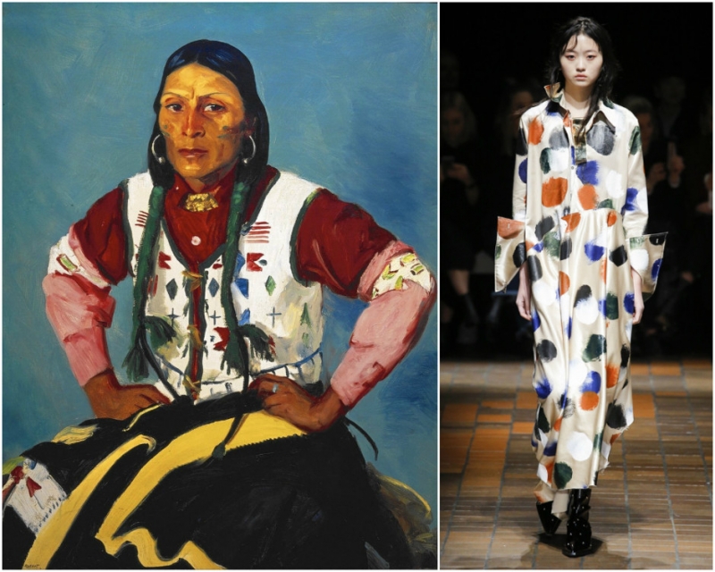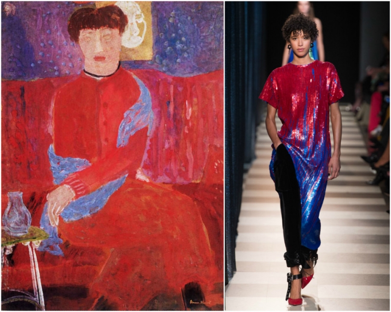 «Сон». Анри Матисс. Образ из коллекции Manish Arora. «Портрет По Тсе». Роберт Генри. Образ из коллекции Marques'Almeida. «Женщина в красном платье». Маргит Анна. Образ из коллекции Monse.