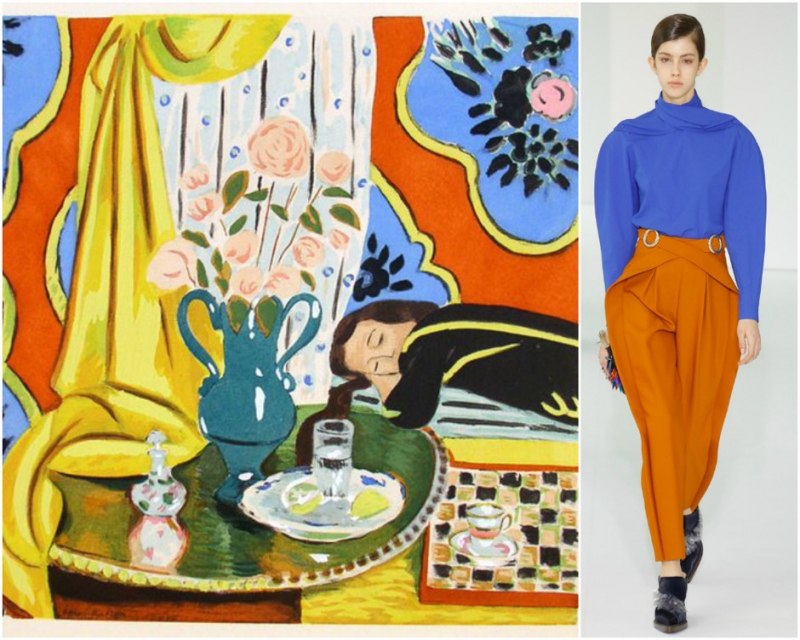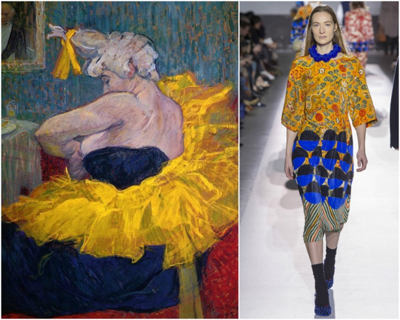 «Цумла». Анри Матисс. Образ из коллекции Delpozo. «Актриса Ша-У-Као в своей гримерной». Анри де Тулуз-Лотрек. Образ из коллекции Dries Van Noten. «Гармония желтого». Анри Матисс. Образ из коллекции Delpozo.