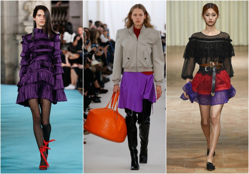 Здесь интересно поиграть фактурами: соединить в образе вещи из кожи или замши с шерстью, кашемиром, шелком. Хотите лук, максимально приближенный к эпохе 80-х? Выбирайте ярко-фиолетовое платье с оборками длины мини и туфли насыщенного красного цвета.