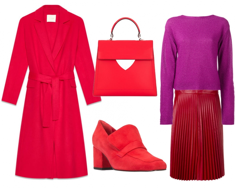 Сочетание фиолетового и красного в моду входит не так чтобы очень часто. Комбинировать платья, обувь, свитеры и брюки таких сложных цветов вне подиума — задача непростая. Но раз уж 80-е столь популярны, то рискнуть все же стоит. Относительно нейтральный образ — красный, приближенный к бордовому, и темно-фиолетовый.