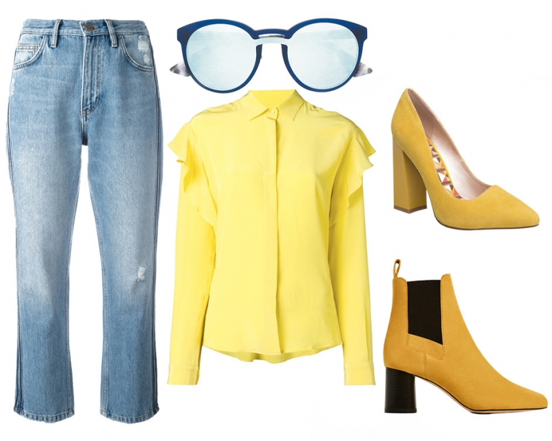 Простой и интересный образ на каждый день — джинсы голубого цвета и желтый аккомпанемент в виде обуви, рубашки, худи или свитера. Добавить синевы можно с помощью ярких солнцезащитных очков. Модели с цветными стеклами — главный хит этого сезона.