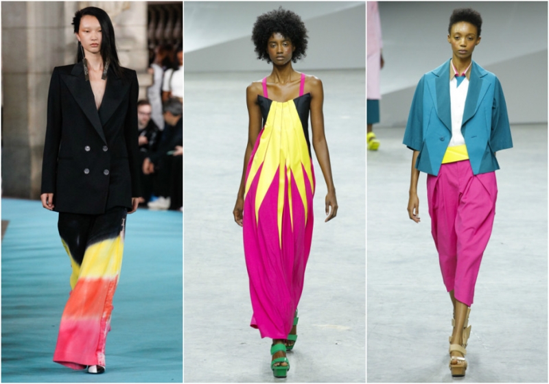Кажется, что микс фуксии, желтого, охристого и розового — история больше про летние образы. Весна только-только началась, уж куда там до буйства тропических цветов. Меж тем, почему бы не совместить легкое платье в стиле tie-dye с черным блейзером (или укороченным пальто) и, например, черными ботинками.