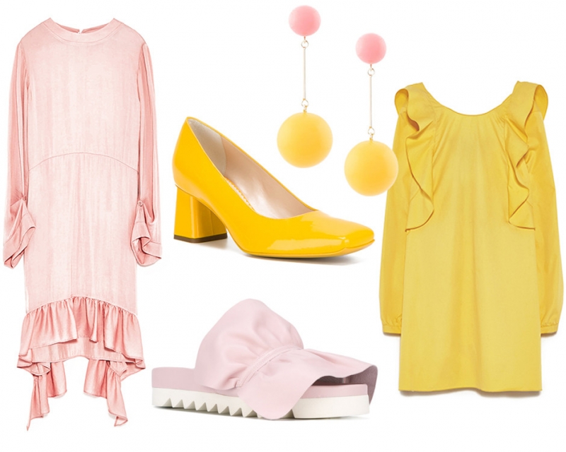 Еще один простой и беспроигрышный способ подружить розовый и желтый друг с другом — собрать образ в пастельных оттенках.