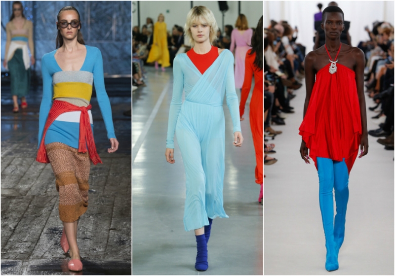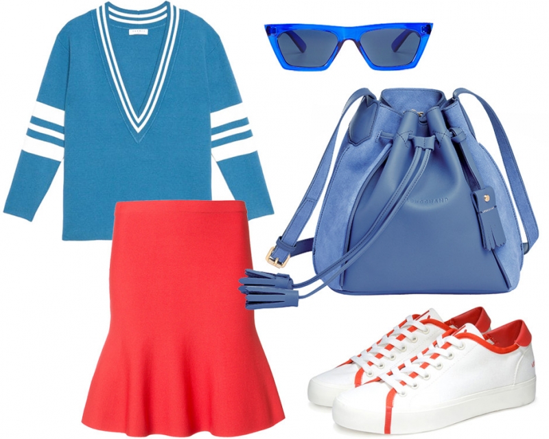 Очень рекомендуем скомбинировать небесно-голубой, лазурный, бирюзовый или индиго с различными оттенками красного. Образы в этой цветовой гамме напоминают сразу три эпохи: в них есть что-то и от 60-х, и от 70-х, и от 80-х. Причем, что интересно, классно смотрятся вещи не только из материалов вроде шелка, тюля или шифона, но и трикотаж, шерсть. Голубой, синий и красный можно дополнять и другими цветами: как нейтральными, так и насыщенными, привлекающими внимание.