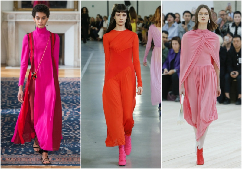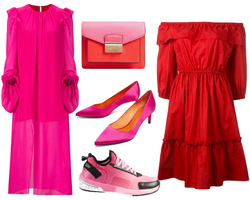 Пожалуй, самое модное сочетание 2017 года — розовый и красный цвет. На наш взгляд, самые красивые образы были на показе Valentino. Идей для реализации тут очень много. Красное платье и нежные, карамельного оттенка туфли, платье цвета фуксии и крупные алые серьги, эффект градиента, широкие розовые брюки и красные кроссовки. Также с насыщенными розовыми платьями можно попробовать надеть красные колготки.