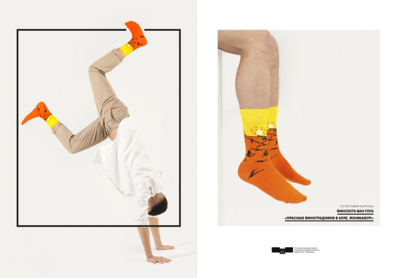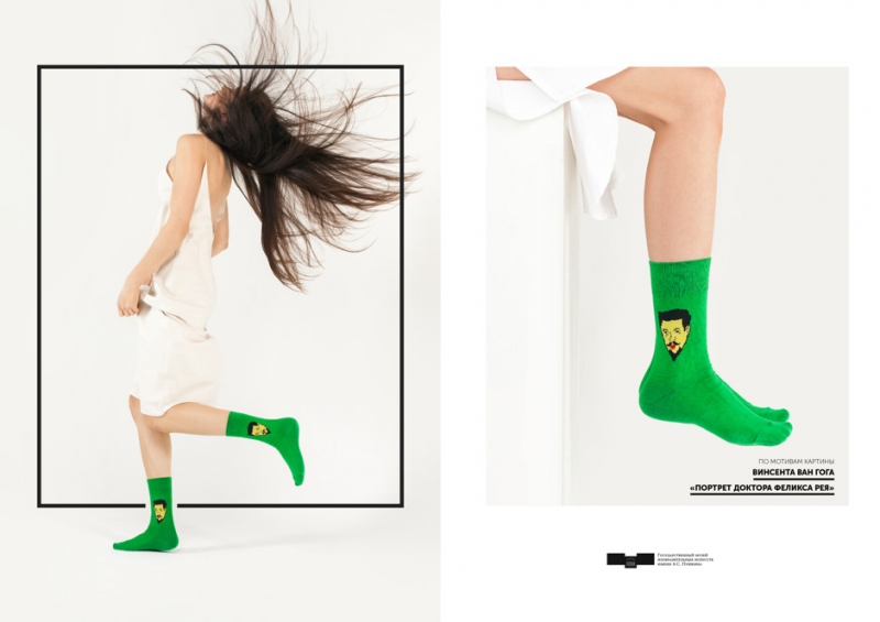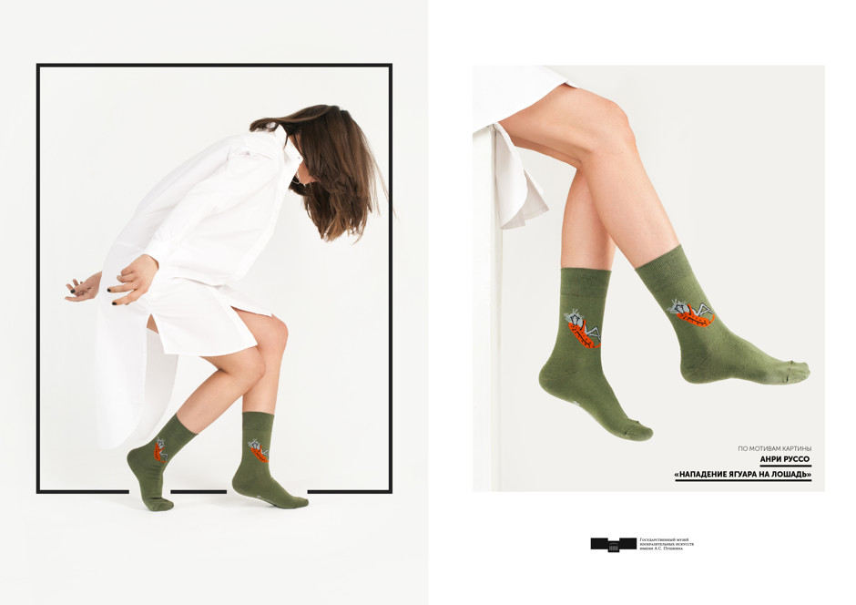 С Пушкинским получилось легко и непринужденно: я хотел им как раз писать, но они меня опередили и первыми написали на почту. Затем мы и они выбрали работы для адаптации в носочный дизайн, и поскольку у всех было взаимное желание уложиться в кратчайшие сроки и успеть сделать релиз в феврале, то выпуск и релиз коллекции прошли очень быстро (примерно 1,5 месяца ушло на все).