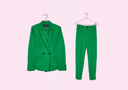 Берем на себя смелость мыслить масштабно целым костюмом, а не вещами отдельно. В этом зеленом костюме и трава зеленее, и солнце ярче, и погода теплее. Носить жакет и брюки не обязательно только вместе, их наручниками друг к другу никто не приковал, так что будь решительна, разделяй и властвуй.