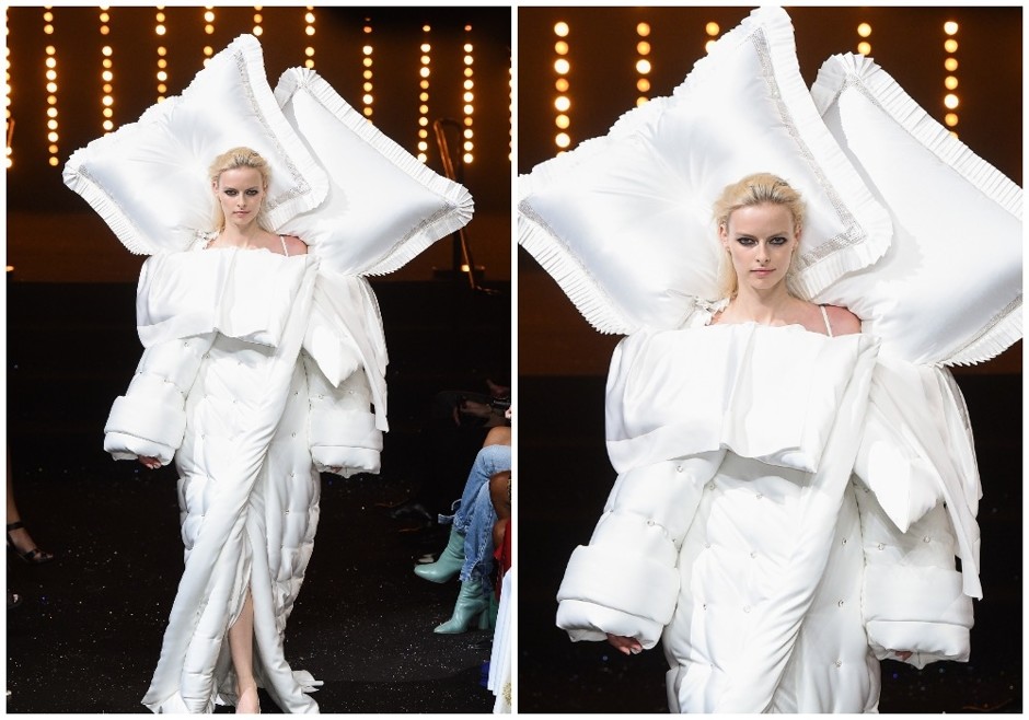 Наверное, каждый из нас хоть раз думал, что было бы идеально прийти на работу или учебу, замотавшись в одеяло. Дизайнеры Viktor & Rolf решили воплотить это желание и сделали уютный образ девушки с подушкой.