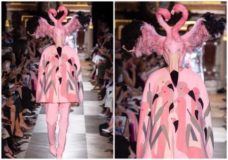 На показе Дома Schiaparelli творился настоящий булгаковский бал Сатаны. По подиуму разгуливали пернатые модели, хищные пантеры, были даже костюмы с заячьими ушами. Но самым запоминающимся стал огромный розовый фламинго.