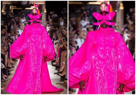 Ярко-розовая «бабочка» в объемном платье прошлась по подиуму в память о том, что Эльза ввела этот цвет в моду. Такую бабочку сложно не заметить, а чтобы поймать, придется искать банку покрупнее.