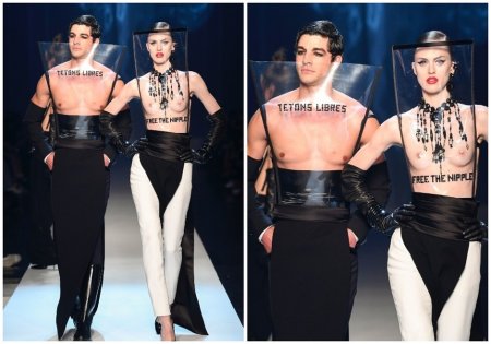 Готье уже не раз шокировал публику нецензурными надписями и попытками объединить мужское и женское начало. Этот раз не стал исключением — вишенкой на торте был выход мужчины и женщины, верхняя часть тел которых была прикрыта прозрачными пластиковыми щитами с надписями «tetons libres» и «free the nipple» — а это уже практически политическое заявление многих женщин Голливуда: свободу соскам, не иначе!
