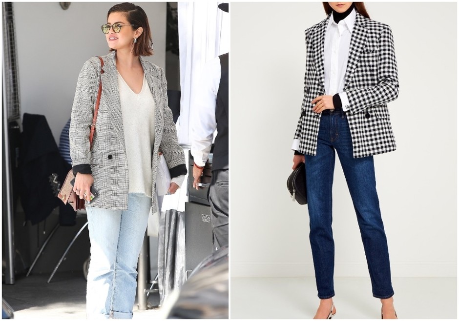 И правда, пиджак, будто снятый с мужского плеча, добавляет силуэту невинности и женственности. Помни о пропорциях: чтобы избежать лишней небрежности в образе, дополни объемный верх безупречно сидящими джинсами и облегающим топом. Осталось добавить подходящие аксессуары — и образ готов.