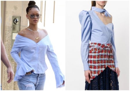 Рианна; блузка DAIZY SHELY (farfetch.com)Хлопковая рубашка — универсальный солдат в гардеробе каждой девушки. В этом сезоне особенно актуальны блузы с необычным кроем: объемные рукава или воланы, асимметричный воротник, деликатные вырезы на плечах добавляют интересной архитектуры в базовую вещь. Берем пример с Рианны: певица сделала удачный акцент на плечах и ключицах, сбалансировав при этом хрупкий и женственный верх хулиганскими джинсами. Неплохой ход!