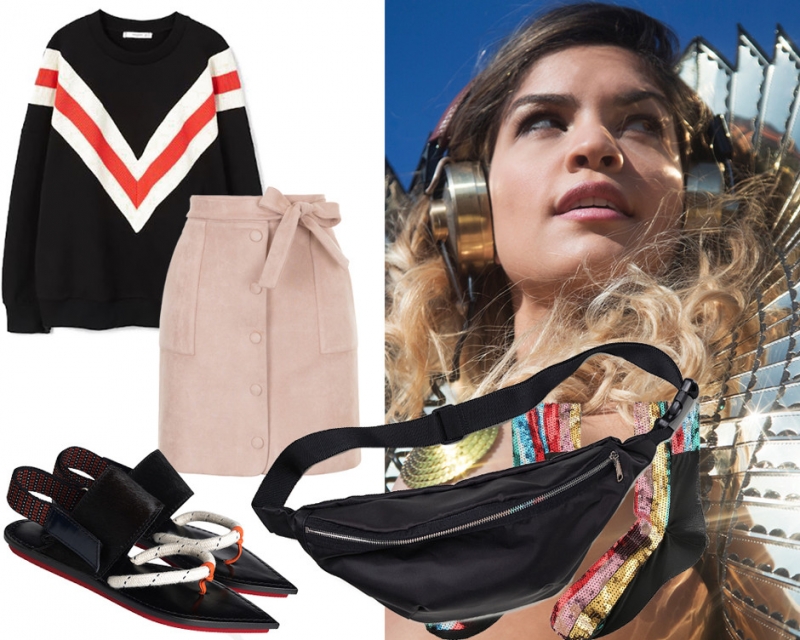 Надень что-нибудь хипстерское, например, юбку со свитшотом и поясной сумкой. Свитшот можно заправить.