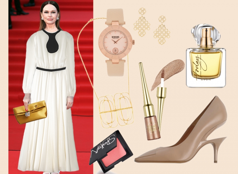 На следующий кинофестиваль Ирине стоит надеть белое шифоновое платье с подчеркнутой талией и четко обозначенным местом декольте — там отделка в виде черной капли, на которой выигрышно будет смотреться золотое ожерелье. Туфли с нестандартным каблуком — маленький бунт против условностей, и захватить золотые аксессуары.