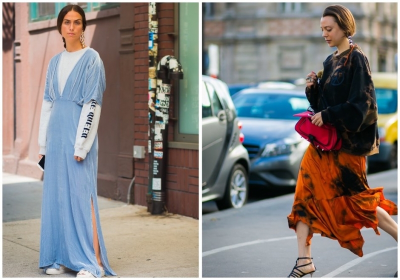 Вижу цель, не вижу препятствий — примерно так нужно поступить, когда хочется надеть летнее платье на тонких бретельках, но прохладный ветер «кусает» незащищенные руки и зону декольте. Используй свитшот — его можно надеть как сверху, так и снизу — в зависимости от того, какое количество платья тебе сегодня хочется продемонстрировать.