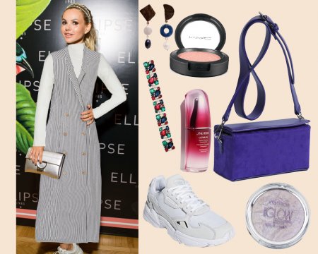 Читательским голосованием было решено примерить на Цигаль светлую, но не блестящую водолазку, длинное платье-жилет, белые кроссовки, винтажный яркий браслет с асимметричными серьгами, фиолетовую сумку, чтобы разбавить «официоз». В качестве бьюти-решения мы предлагаем макияж глаз в персиковых оттенках, космически-блестящий хайлайтер для всех выступающих поверхностей и сыворотку-концентрат (в очень красивом флаконе) для вечной молодости.