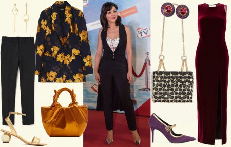 Первый — это черные брюки и жакет с золотыми цветами (по богатству принта напоминающий настоящую парчу), с подходящими черно-золотыми аксессуарами. Кстати, под жакет уже не обязательно что-то надевать.