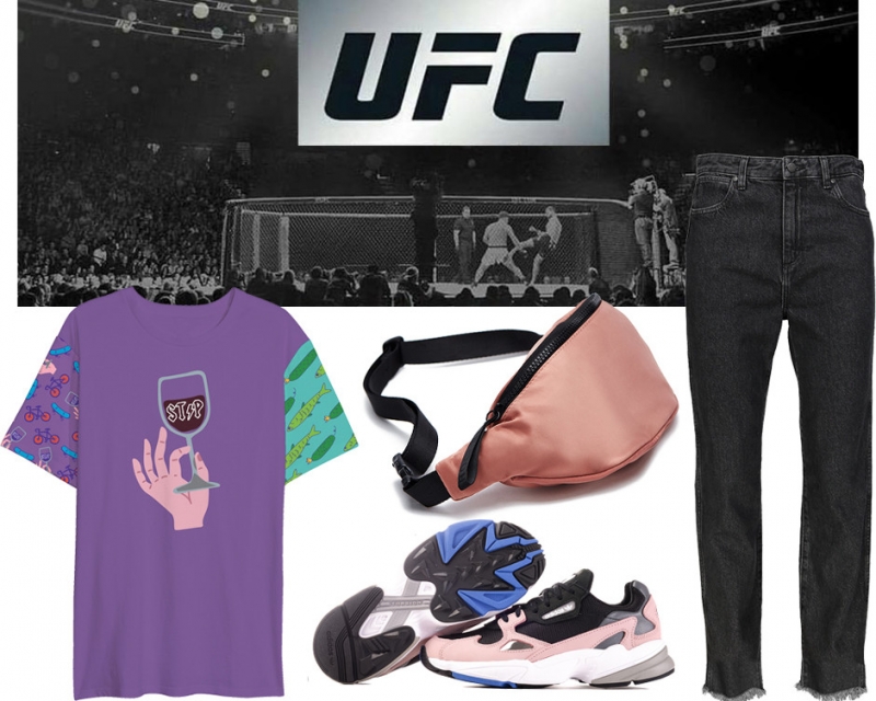 Футболка St.Friday Socks; сумка Bershka; джинсы Wrangler; кроссовки adidas Falcon (street-beat.ru)Хлеба и зрелищ требуют наши сердца, если твое тоже — отправляйся на турнир UFC, который пройдет в «Олимпийском». Событие знаковое, потому что раньше такие вещи нам приходилось смотреть исключительно по телевизору, но в эти выходные за 25 лет существования он впервые пройдет в России.