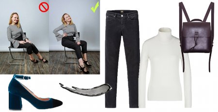 Надевай то, в чем будет хорошо видно твое тело (с ним же учимся работать), например, джинсы, водолазку и туфли на удобном каблуке (если совсем отказалась от этого вида обуви — просто кроссовки).