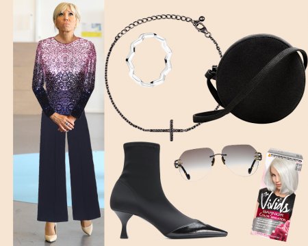 Тем не менее голоса за лучший наряд мы собрали и решили примерить на Брижит брюки и боди в пайетках. И даже несмотря на то что не все рискнут надеть такую яркую вещь, мы уверены, что чувства юмора Макрон не лишена и вполне могла бы примерить ее со свободными брюками, ботинками с контрастным носком, лаконичными украшениями и интересными очками. А в качестве бьюти-обновления рекомендуем ей новый серебристый оттенок волос.
